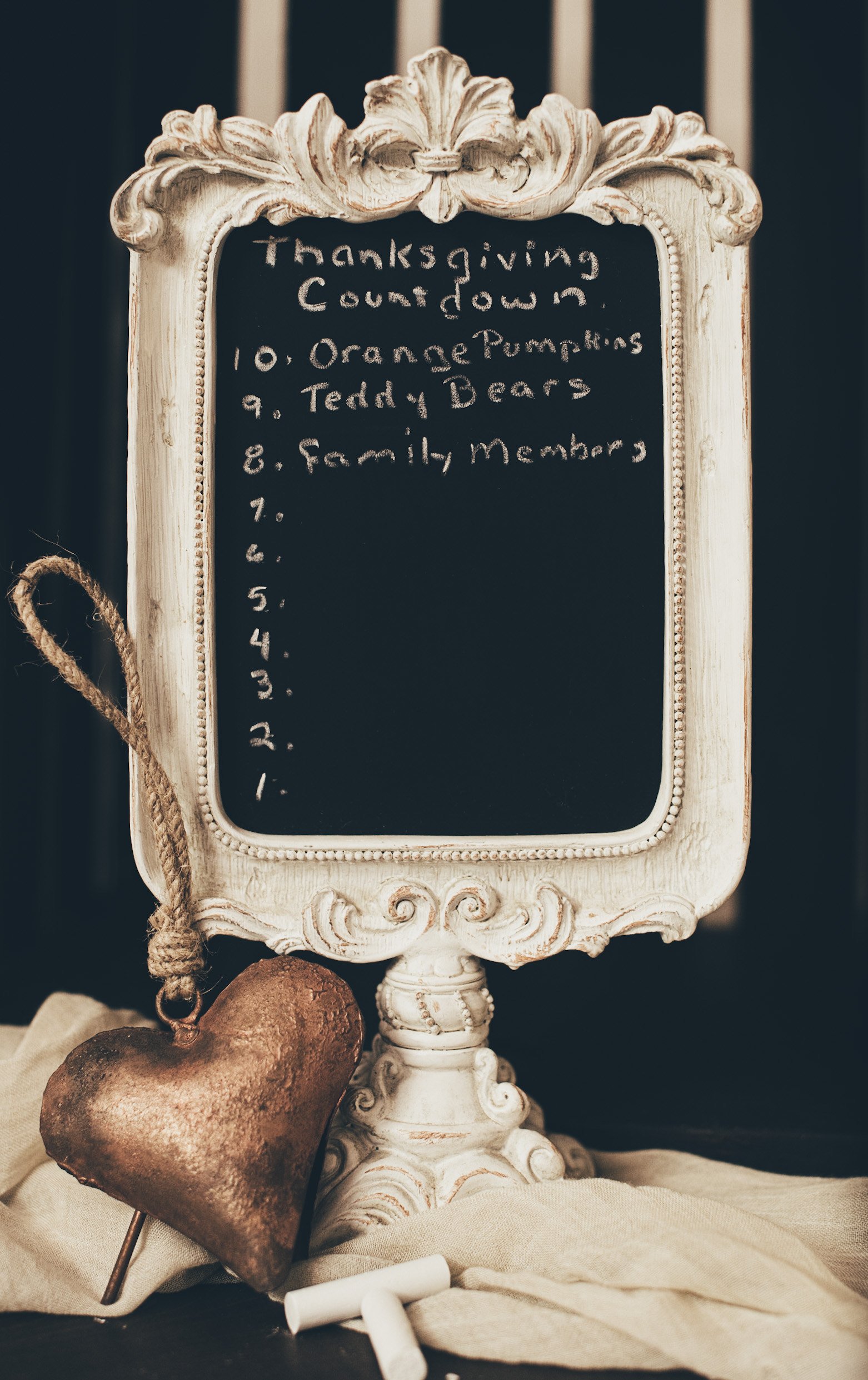 Start by compiling your list on a roll of paper. Crumple it up a bit and then dye it by dabbing it with a used, damp tea bag to create a worn, primitive look. Attaching wooden dowels to either end is a fun but optional touch. Roll both ends toward the center and use twine or pretty ribbon to secure the scroll. Place it on the Thanksgiving table, perhaps in a basket or vase, until you are ready for a dramatic unrolling of the scroll and a joyful recitation of all that your family is thankful for.