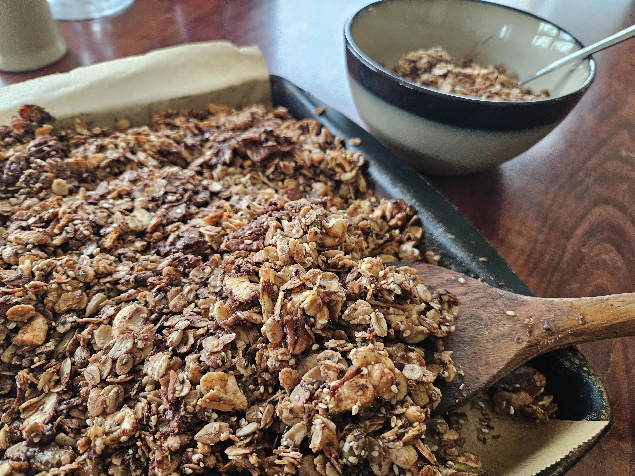 When Palmer was a tween he took on the role of granola maker in our family. The recipe he followed was heavy on the oats, which made the end result a rather dry, flakey kind of granola. It was good but I tend to like a little chunkier granola, something that is a little sticky and has some heft to it. When his high school schedule did not afford much time for granola making, I took the role back over and tried a recipe that was super nutty and seedy. It was called “Superwoman Granola” because of all the hormone supporting powers of the many nuts and seeds. For a while we all ate Superwoman Granola (even the menfolk) but some were missing the oaty days of yore so I decided to find a middle ground.